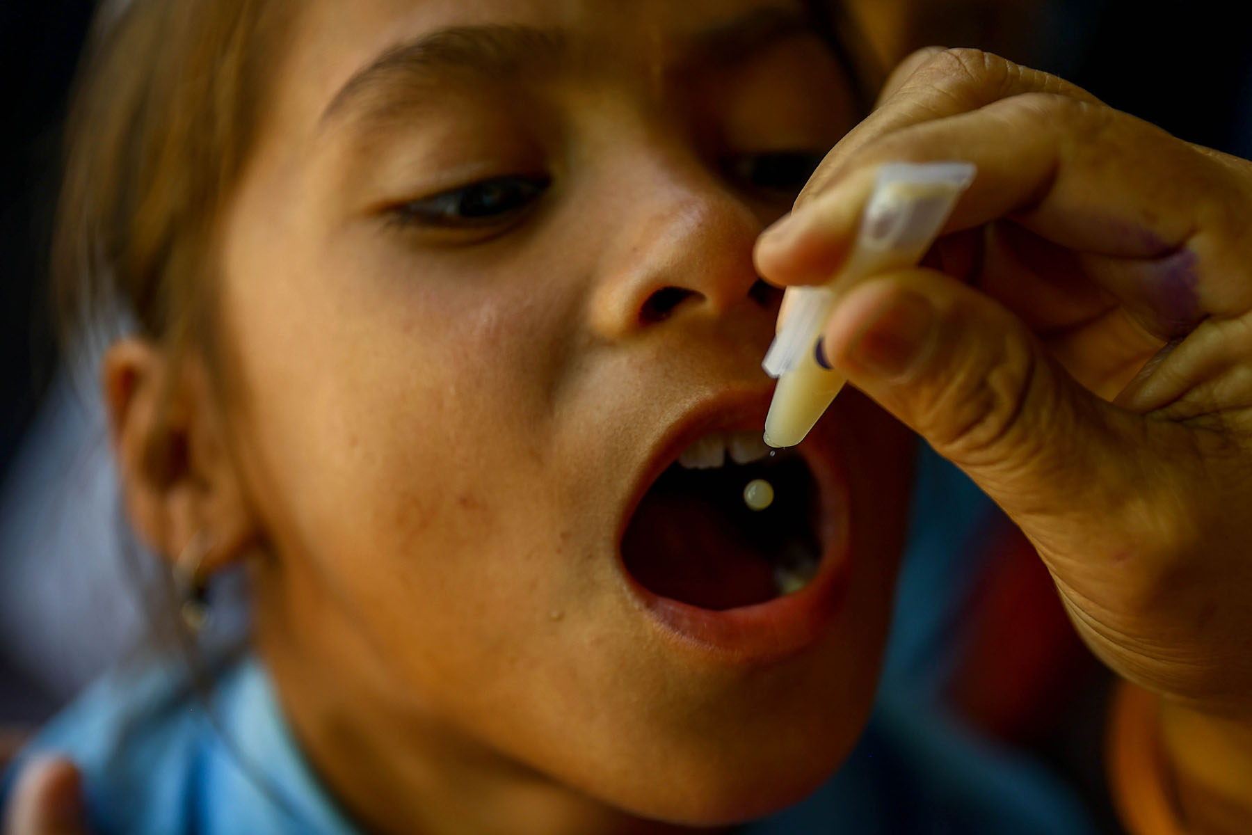पर्सा जिल्लामा हैजा खोप अभियानको क्रममा एक डाक्टरले एक विद्यार्थीलाई मुखबाट हैजा खोप लगाउँदै