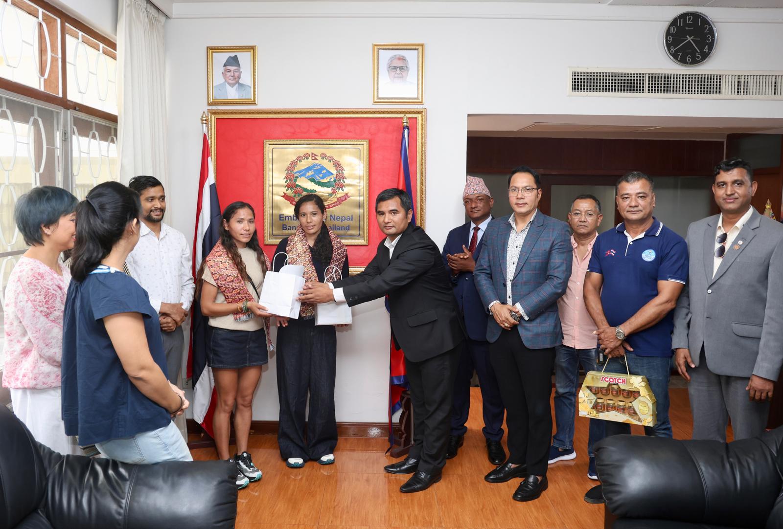 कार्यक्रममा नेपाली राजदूतावासका उपनियोग प्रमुख मोतीबहादुर श्रीसले धावकद्वयलाई बधाई दिँदै खादा लगाई मायाको चिनो प्रदान गरी सम्मान गर्नुभयो । उहाँले नेपाली खेलाडीको अन्तरराष्ट्रिय सफलताले नेपाललाई विश्वमा चिनाउन महत्त्वपूर्ण योगदान पुर्याउने उल्लेख गर्दै भविष्यमा पनि यस्ता प्रतिभालाई प्रोत्साहन गर्न राजदूतावास सधैँ साथमा रहने प्रतिबद्धता व्यक्त गर्नुभयो । उहाँले दूतावासले आयोजना गर्न लागेको लुम्बिनी नेपाल मिनी म्याराथुनका बारेमा समेत प्रकाश पार्नुभएको नेपाली दूतावास बैङ्ककले जनाएको छ ।